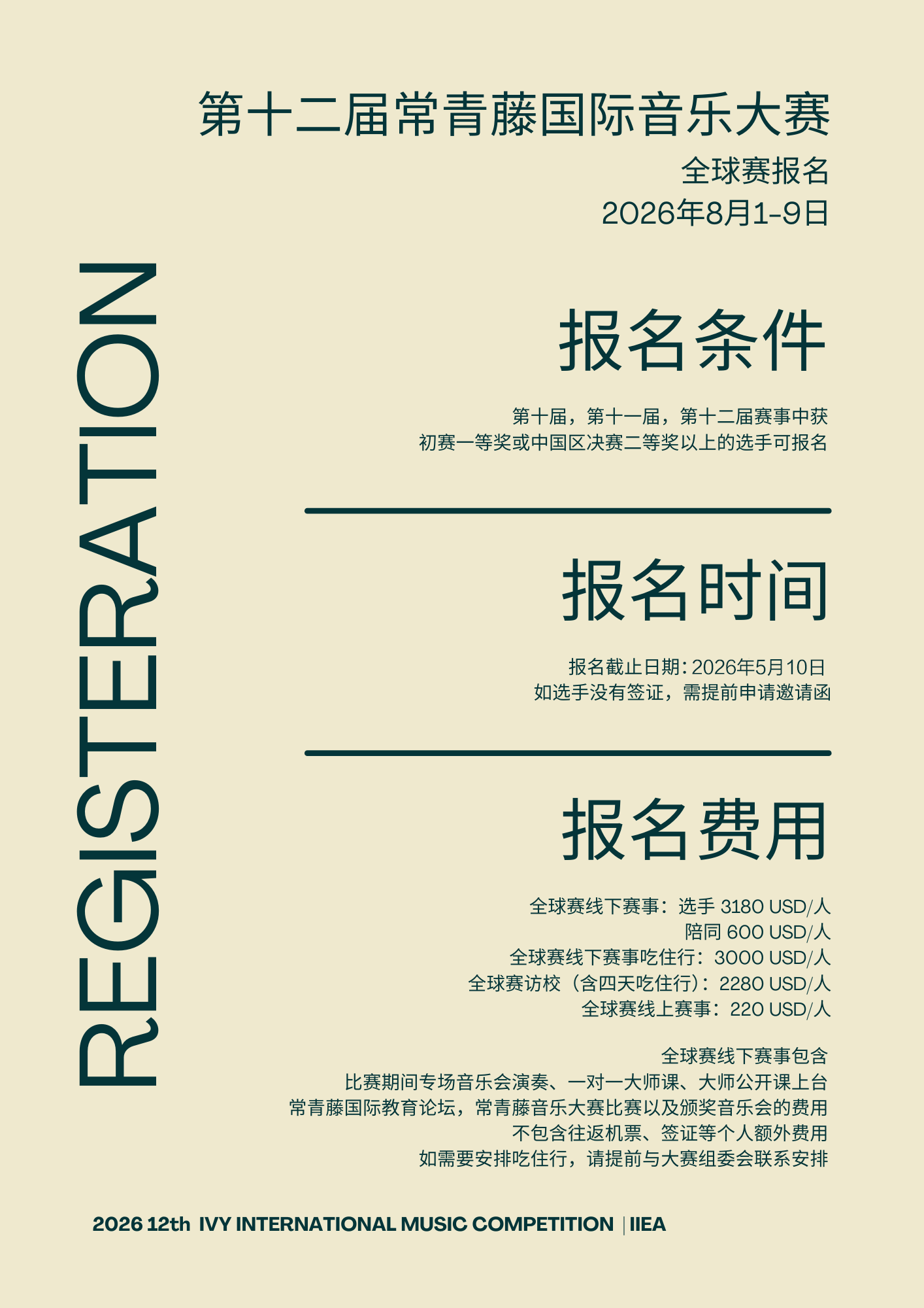 全球赛线下赛事包含比赛期间专场音乐会演奏、一对一大师课、大师公开课上台常青藤国际教育论坛,常青藤音乐大赛比赛以及颁奖音乐会的费用。不包含往返机票、签证等个人额外费用。如需要安排吃住行,请提前与大赛组委会联系安排。