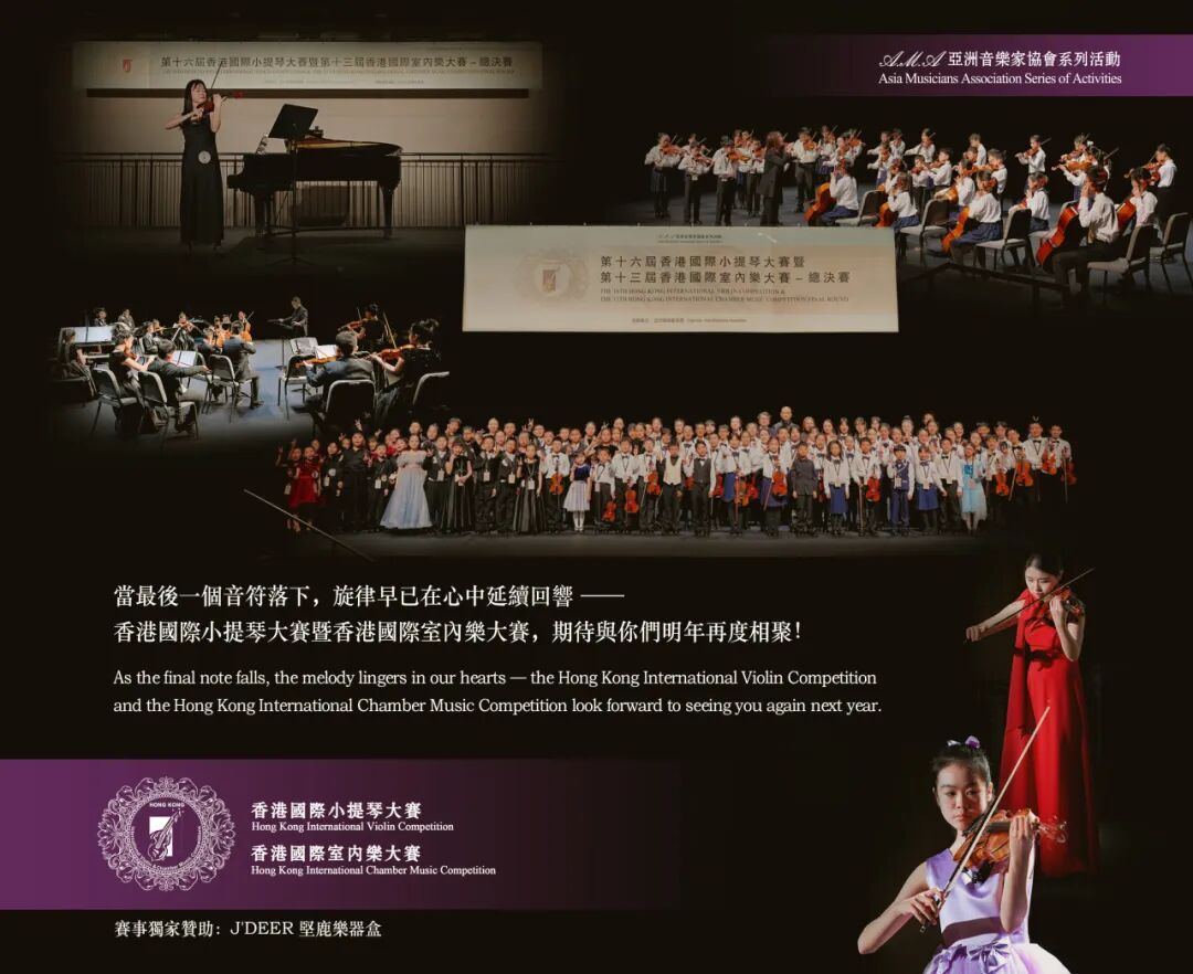 We sincerely thank every contestant for their wholehearted dedication, the teachers for their guidance and support throughout, the jury for their professionalism and insight, and all the audience members for their enthusiastic encouragement. It is this love for music and long-standing perseverance that has given the competition a warmth and significance that transcend the stage. When the final note falls, the melody continues to resonate in our hearts. We look forward to seeing you again next year at the Hong Kong International Violin Competition and Hong Kong International Chamber Music Competition!